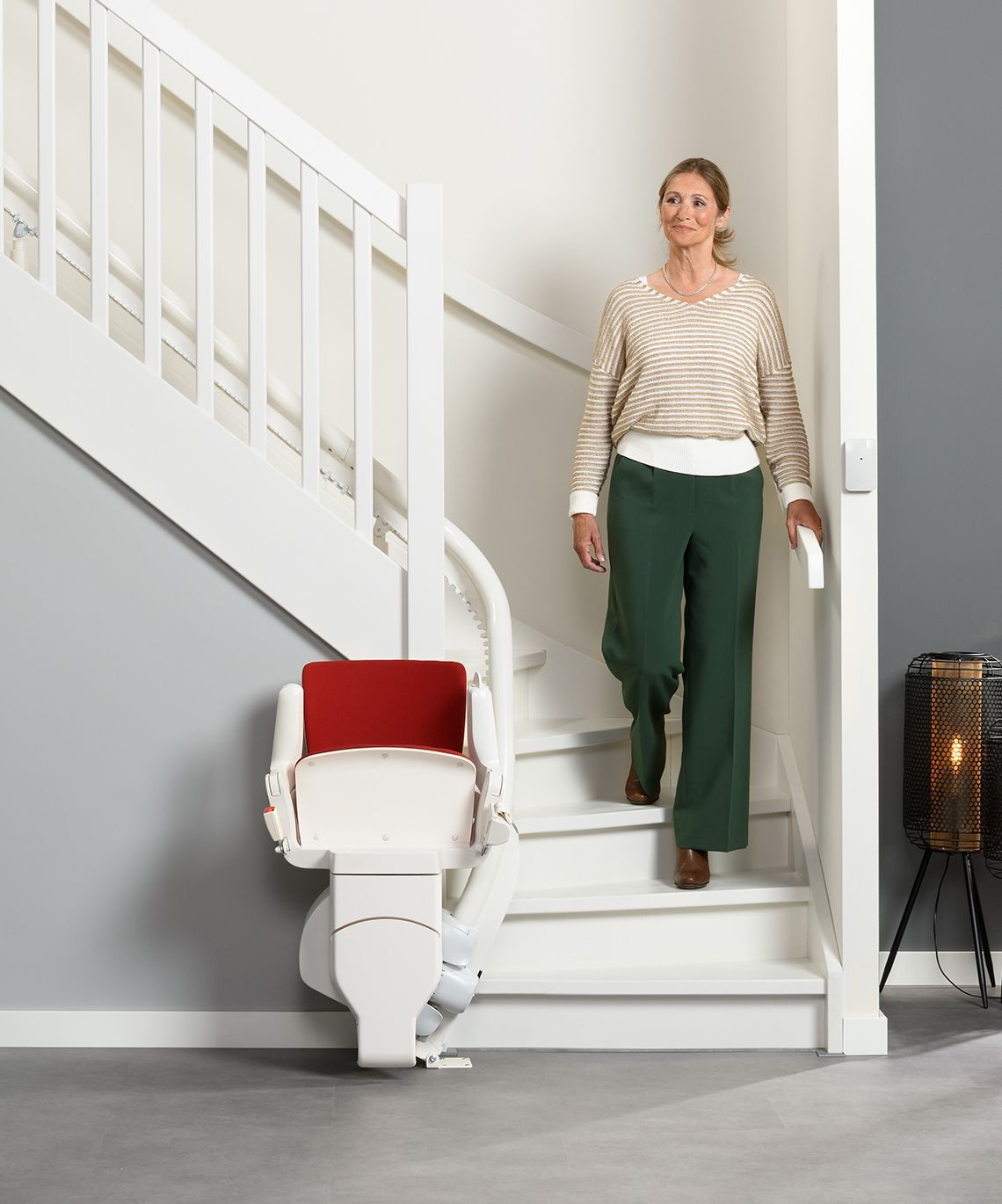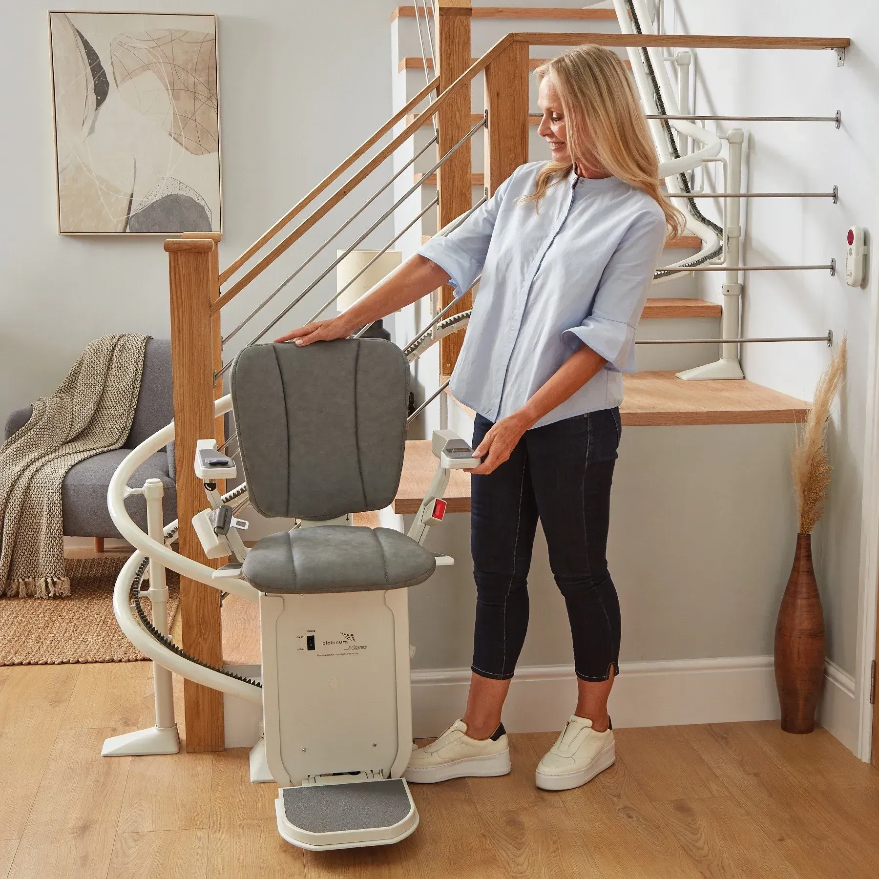 Flow X is our most complete curved stairlift. It has been designed to blend innovation with an inspiring contemporary design by Pearson Lloyd.